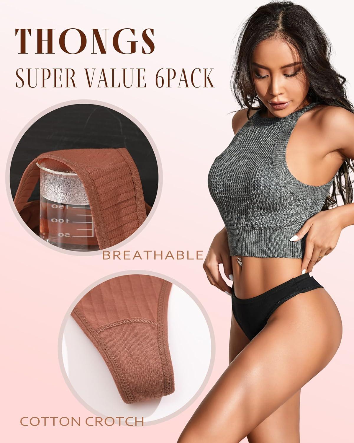 FINETOO Cotton Thongs for Women Soft Low Rise Sexy Thong Ladies Panties Womens Underwear 6 Pack XS-XXXL(Black+beige+white+purple+coffee+brown)